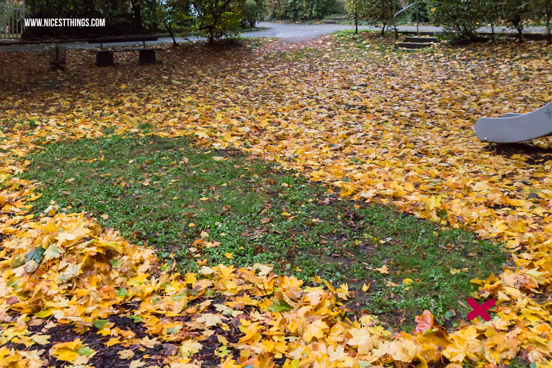 Mit dem pünktlichen Feierabend wurde es am Sonntag allerdings wieder nix. Während ich herzhafte Kürbiswaffeln in unserem Innenhof fotografierte, bemerkte ich auf einmal, dass ein Teil an der Kamera fehlte: Dieser kleine Ring auf dem Drehrädchen für den Modus, der M, Av und so weiter anzeigt, war weg. Vorher in der Wohnung war er noch da, ich hatte ihn irgendwo auf der Wiese verloren. Ich habe also systematisch die Blätter durchgewühlt, weggetragen und auf einem Haufen gesammelt. Nach über einer Stunde, es dämmerte schon, habe ich das Teil tatsächlich unten rechts gefunden:
