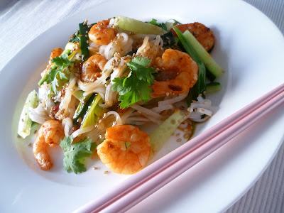 6. Nun einfach alles mischen und mit Fischsauce, Chilisauce, Salz, Pfeffer und geriebener Chilischote abschmecken. Mit frischen Korianderblättern dekorieren.