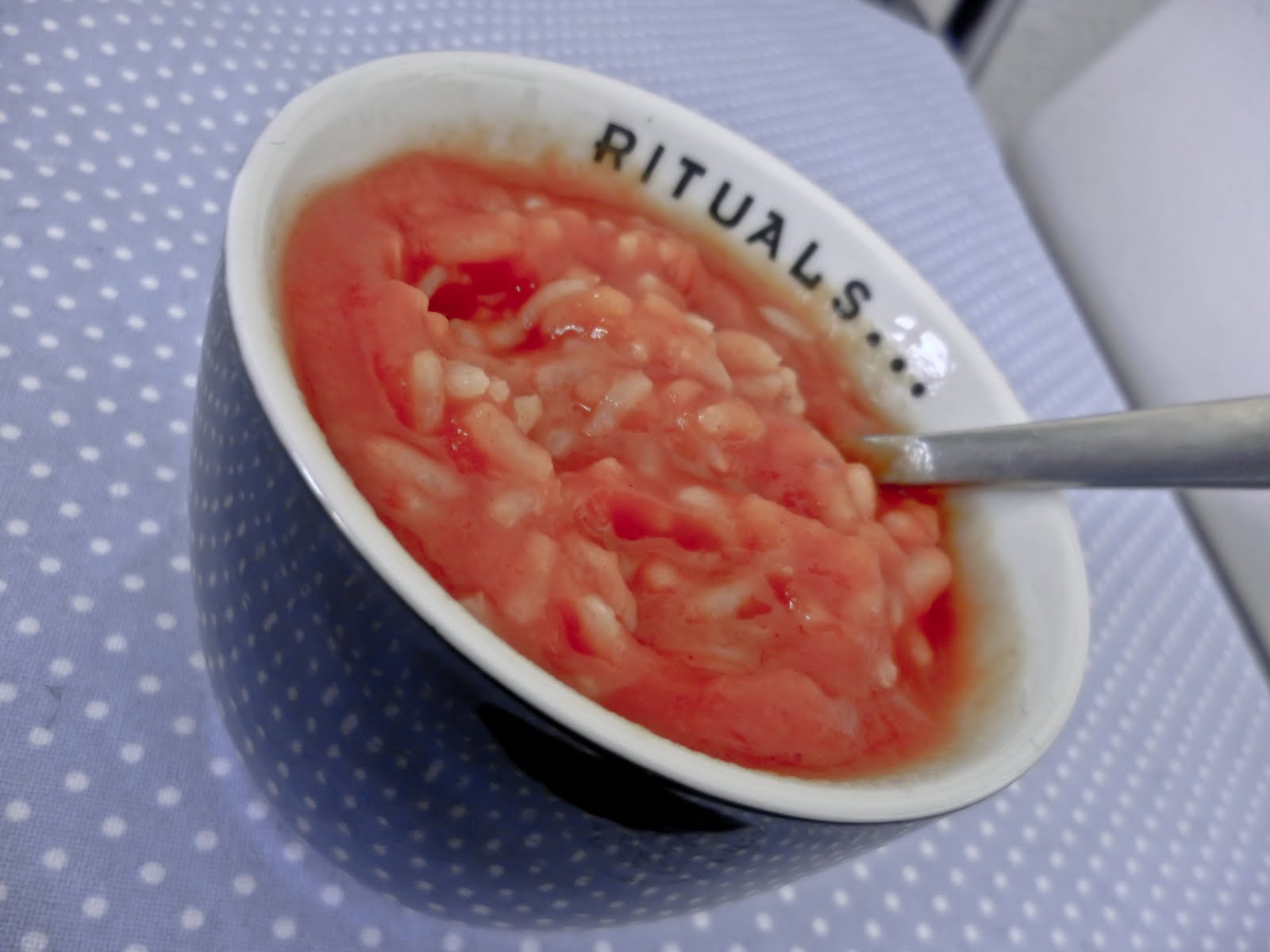 Da unser Entlastungstag gestern irgendwie in eine Obst-Gemüse-Vollkorn-Nüsse-Joghurt-Orgie ausgeartet ist und wir uns gestern abend dann doch etwas vollgefressen fühlten, kommt heute noch ein “richtiger” Entlastungstag. Also nur Reis mit ein bisschen Fruchtpüree oder Kräutern und Tomaten.
