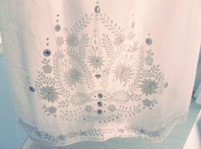 Es war um 25% reduziert und ich finde es wunderschön mit den aufwändigen hippiesken Stickereien und kleinen Spiegeln. Das Oberteil ist gesmokt, unten fällt es ganz bequem – Empirestil eben, wie ich ihn liebe.