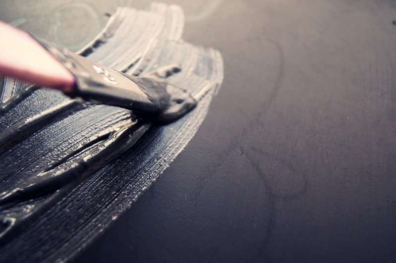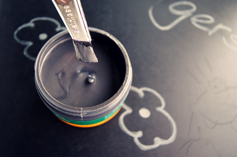 Man muss mehrere Schichten aufpinseln und diese dazwischen immer gut trocknen lassen, sonst deckt die Farbe nicht richtig. Wenn sie trocken ist, kann man die Tafel ganz normal mit Kreide beschreiben und diese immer wieder wegwischen.