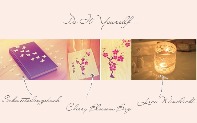 Erkennt ihr das Windlicht mit der Tortenspitze wieder? Das hier ist das Original, welches mich inspiriert hat. Auf meiner Liste stehen außerdem noch die wunderbare Do It Yourself-Kirschblütentasche und ein Buch mit solchen ausgestanzten Schmetterlingen bekleben möchte ich auch noch.