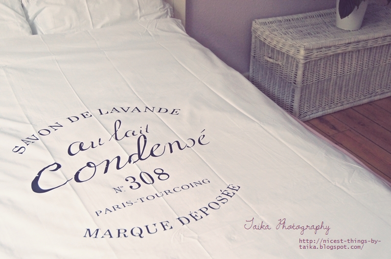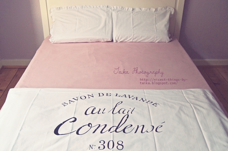 Ich mag ja solche Shabby-Aufdrucke total. Wobei mir Seife mit Kondensmilch zwar etwas merkwürdig vorkommt, aber egal. Man sollte wohl einfach nicht zu viel über den Sinn von Bettwäscheaufschriften sinnieren…