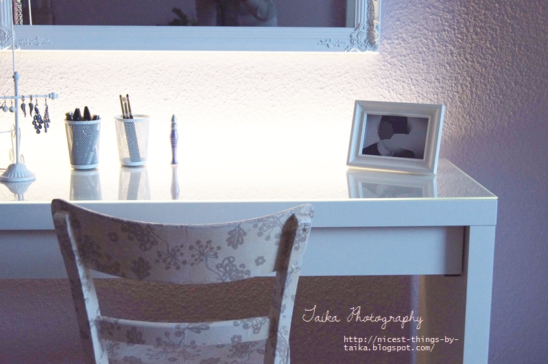 Wie die meisten von euch wahrscheinlich erkannt haben, ist das schlicht und einfach der gute alte Ikea Malm Frisiertisch in Weiß. Für die indirekte Beleuchtung haben wir ein paar von den Ikea Ledberg-LED-Lichtleisten aneinandergesteckt, in die Rückseite der Tischplatte 4 Nägel geschlagen und die Lichtleiste mit den LED’s nach oben darauf abgelegt. Das Kabel haben wir mehr oder weniger elegant hinter der rechten Seite runtergeführt.