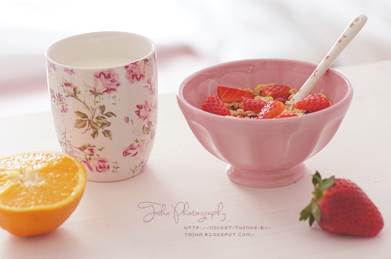 Vollkornmüsli mit Cornflakes, Amaranth, Dinkelflocken und frischen Erdbeeren, Sojamilch und eine Orange. Das Schälchen und den Porzellanlöffel habe ich neu, der Löffel ist von Green Gate und das Schälchen von Nordal Homeware.