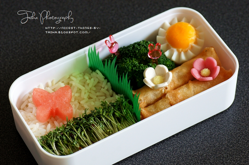 Rechts: Mini-Frühlingsrollen, Broccoli, gekochtes Ei, Zuckerblumen.