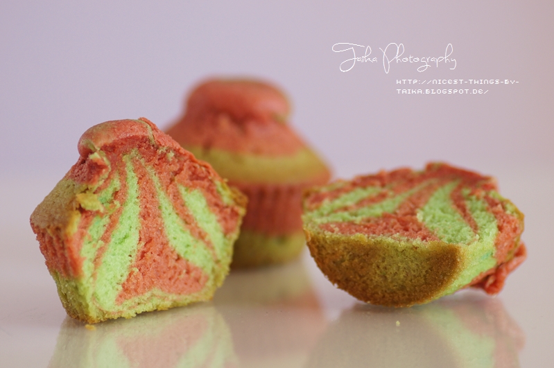 Da ich von beiden Farben noch Teigreste hatte, habe ich die einfach mal bunt gemischt ebenfalls in Silikonförmchen gegeben und mitgebacken. Das Ergebnis sah irgendwie sehr interessant aus: Volcano-Cupcakes 😀