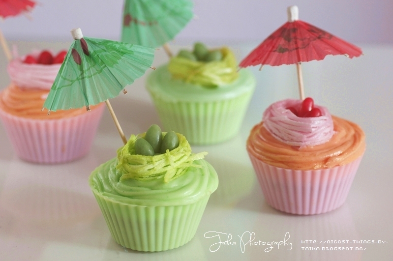 Von Sweet Laura*, einem ganz ganz süßen Shop für Backzubehör, hatte ich unter anderem diese tollen Retro-Papierschirmchen* bekommen. Ich liebe sie! Als Kind war das jedes Mal ein Highlight, wenn in einem Eisbecher ein solches Schirmchen steckte. Ich habe es immer mit nach Hause genommen und als echtes Kind der Achtziger zum Beispiel einen Strand mit Sonnenschirmen für die Babyponies von Mein kleines Pony gebaut. Aber da ich ja nun schon groß bin, habe ich äußerst erwachsene Oster-Cupcakes mit buntem Teig und kleinen Osternestern unterm Sonnenschirm damit fabriziert 😉