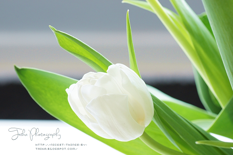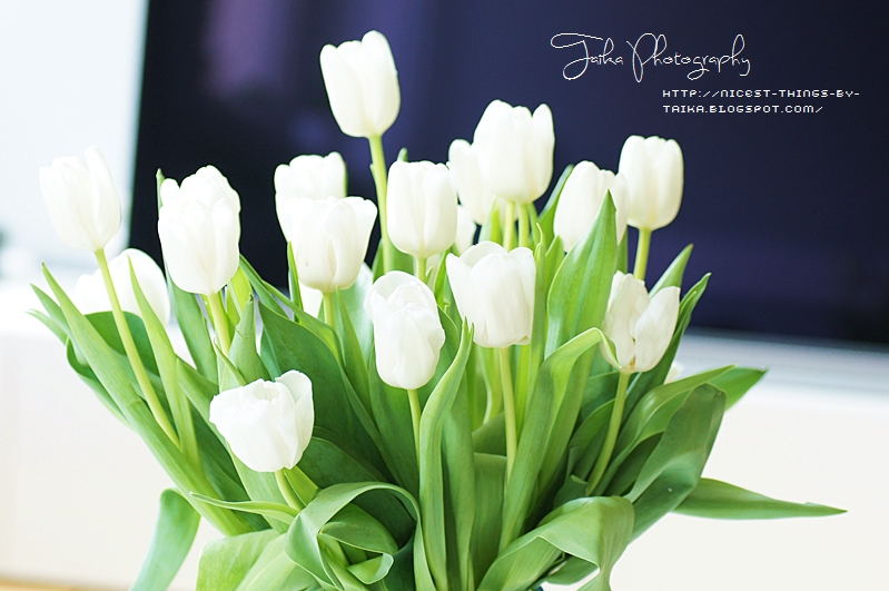 Und um das mal ordentlich zu unterstreichen, habe ich mir einen Strauß weiße Tulpen geleistet, der jetzt zusammen mit den mittlerweile aufgeblühten Hyazinthen in unserem Wohnzimmer Frühlingsstimmung verbreitet.