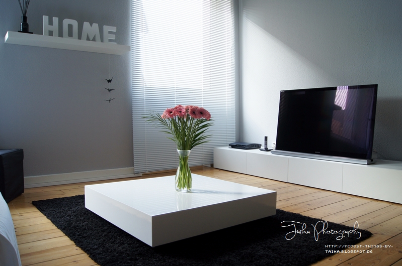 Joa… so sieht es jetzt aus. Es sind außer den Jalousien noch ein paar Kissen neu dazu gekommen, 2 schwarze Sitzwürfel, kleine Dekosachen wie der Raumduft und die Kraniche und frische Blumen auf dem Tisch. Diese Ikealampen kann ich übrigens nur sehr bedingt leiden, da sie ja ungefähr so verbreitet sind wie Heuschnupfen. Aber ein schönes Licht machen sie ja schon und wie gesagt, neue Lampen sind bereits bestellt. Ach ja, und die weißen TV-Elemente haben sich vermehrt, die nehmen jetzt die ganze rechte Wand ein.