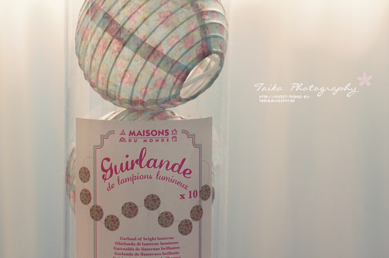 Mein neuer Lieblingslieblingslieblingsladen ist Maisons du Monde. Mädels, ihr würdet anfangen zu kreischen, wenn ihr das Angebot sehen würdet! Ein Paradies an Möbeln, Decken, Geschirr, Dekoartikeln, Heimtextilien… alles weiß lasiertes Holz, altrosé, Punkte, Rosalimuster… aber echt geschmackvoll. Mein Puls war bei 140 und ich habe panisch alles in mein Einkaufskörbchen geworfen, was nur ging. Vor allem, die Sachen sind nicht mal teuer. Ein Teller, 2,50€. Hab dann aber noch mal aussortiert, es leppert sich dann ja doch. Mitgekommen sind letztendlich: Ein Spitzentellerset in Weiß und Taupe, ein rosafarbener und ein mintgrüner Teller mit weißen Punkten, Eine Spitzentasse mit Untertasse in Taupe, ein Frühstücksschälchen, eine Dekoflasche für meinen Schminktisch und eine tolle rosafarbene weiß gepunktete Wachstuchtischdecke. Und eine Lichterkette mit Rosali-Lampions: