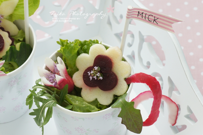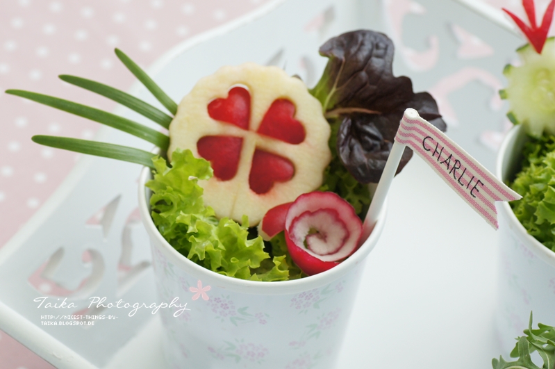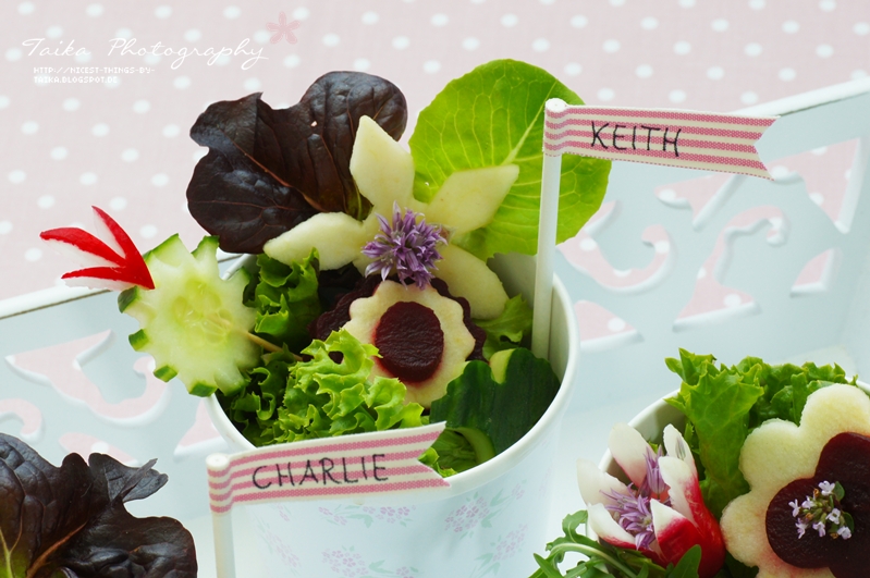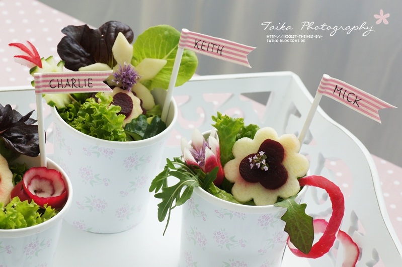 Ihr könnt echt alles in diesen kleinen Salatbechern verwerten. Bei mir waren es verschiedene Salatsorten wie Rucola, Löwenzahn, Radicchio, Lollo Rosso, Pflücksalat. Dazu passen Radieschen, Rote Beete, Rettich, Gurke… mit Blüten von Schnittlauch oder Thymian kann man das Ganze optisch noch pimpen. Auch etwas Obst wie mal ein Stück Apfel macht sich gar nicht schlecht.
