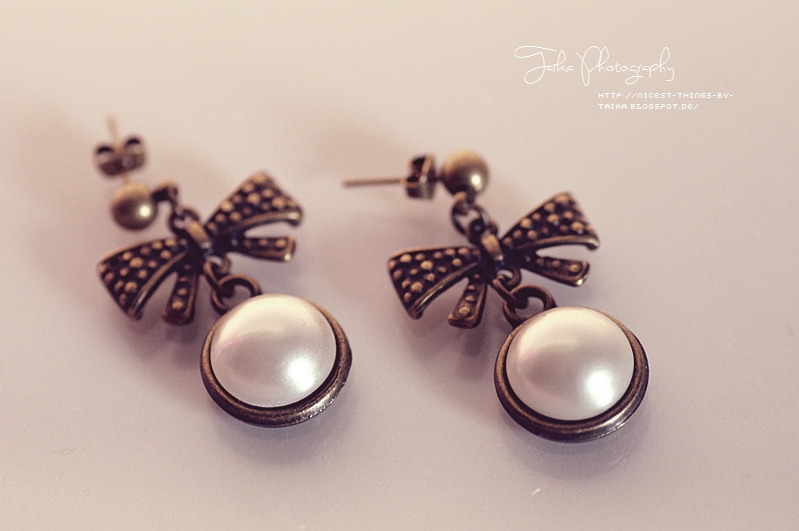 Mein melodramatisches Augenmakeup (ja ich weiß, ist doof geblendet, also gar nicht) und die zerzausten Haare bitte ich zu entschuldigen. Aber davon kann ich nun sowieso ganz wunderbar ablenken, und zwar durch diese schönen Ohrringe. Solche Vintage-Schleifen liebe ich ja und die Kombi mit dem cremefarbenen Cabochon hat echt was, finde ich.