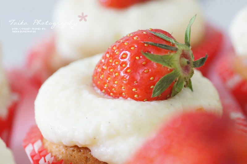 5. Nun die Erdbeerstückchen unterheben und den Teig in die ausgelegten Vertiefungen des Muffinblechs geben, so dass die Papierförmchen ungefähr zu 2/3 gefüllt sind.