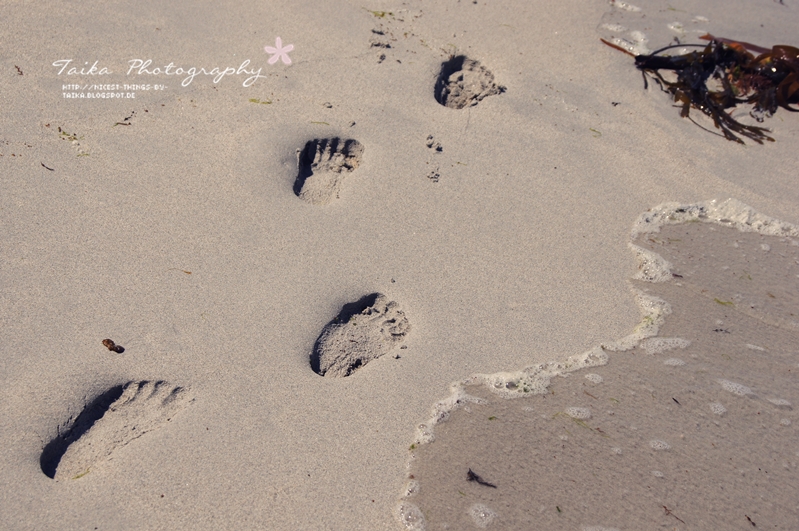 Es ist zuerst immer eiskalt, wenn man den ersten Fuß an den Spülsaum hält und von der nächsten Welle überspülen lässt. Kleine Tangstücke und Algen bleiben auf meinem Fußrücken zurück, man sackt ein Stückcken tiefer in den Sand ein – bis die nächste Welle kommt.