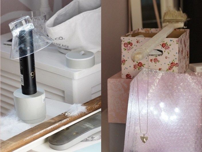 Seinen eigenen Regenbogen kann man übrigens ganz einfach selbst erzeugen, indem man ein umgedrehtes Dessertschälchen mit dickem Glasboden auf eine Flasche Hitzeschutzspray in die Sonne stellt. Und eine Bokehstation ist schnell gebaut aus Kisten, einer Pappe mit Alufolie, rosa Knackfolie, einer Batterie-Lichterkette und einem langen Max (der Pinsel da). Weil ihr doch manchmal ganz gerne seht, wie chaotisch das so bei mir abläuft 😉