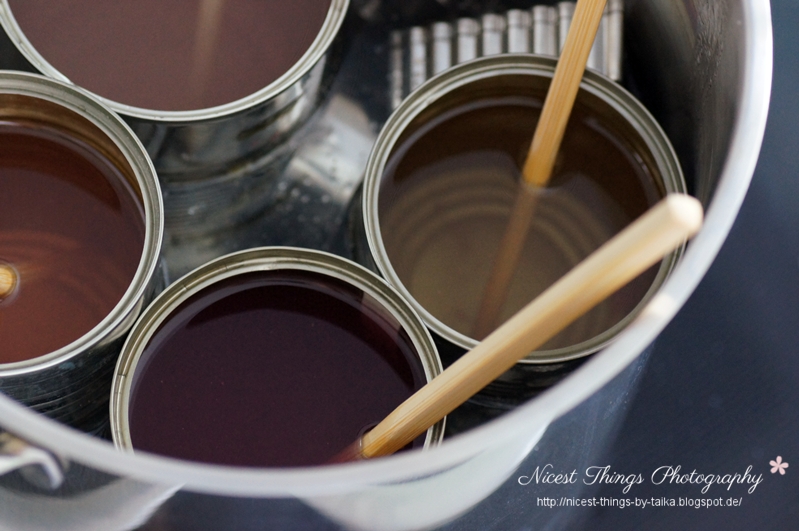 1. Zuerest die Wachsreste vorsichtig in grobe Stücke hacken, alten Docht dabei entfernen. Schneidet euch aber nicht dabei, Wachs ist ganz schön rutschig. Die Blechdosen damit befüllen. Überlegt euch, welche Farben eure Kerzen später haben sollen. Je nachdem nehmt ihr mehr oder weniger weißes Wachs, etwas Pigment, ein paar Stückchen buntes Wachs… und natürlich das Citronellaöl! Da könnt ihr ruhig ordentlich zulangen, ich hatte so ca. 15 Tropfen pro Blechdose.