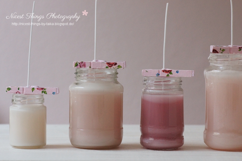 5. Die Gläser nun möglichst nicht mehr bewegen, eine Haut bildet sich schon nach ca. 10 Minuten. Nach ca. 6 Stunden ist das Wachs fest, natürlich abhängig von der Größe eurer Kerzen. Falls euch übrigens die Wäscheklammern gefallen: Hier findet ihr mein DIY Wäscheklammern gestalten mit Decopatch.