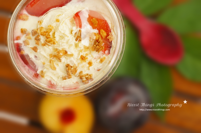 Ups. Schon wieder was Fettes zubereitet und auch natürlich auch gegessen. Im Moment ist es aber auch schlimm. Mein Gehirn hat sofort gecheckt dass es jetzt kühler wird und möchte, dass ich mir schleunigst einen ordentlichen Winterspeck anfuttere. Dass ich sowas schon habe, ist ihm egal. Es brüllt mich ständig an: “Hunger! Hunger!” Dagegen bin ich machtlos. Das Einzige was ich machen kann, ist noch zu allem verzweifelt ein Motivationsobst / -gemüse dazuzupacken. So wie bei diesem Dessert mit Mascarpone, Sahne, Zucker und einer Spur Pflaume.