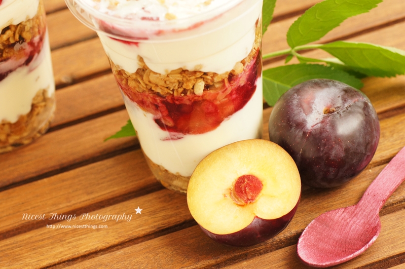 3. Haferflocken, Mandeln, Zucker, Honig, Öl, Vanille und Zimt in einer Schüssel gut vermischen. Ein Backblech mit Backpapier auslegen und die Mischung darauf ausbreiten. Ca. 40 Minuten bei 200°C Umluft rösten. Aufpassen dass es nicht zu dunkel wird und nach der Hälfte der Zeit mal umrühren. Auskühlen lassen. ODER: Einfach Fertig-Knuspermüsli nehmen, da gibt es sogar welches mit Pflaume-Zimt -Geschmack von Kölln. Ratet mal, wer das so gemacht hat. Madame ist nämlich nicht nur verfressen, sondern auch faul, haha.