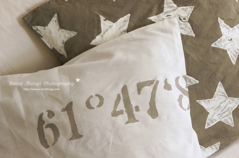 Die Koordinaten sind bissle schlampig geworden. Aber man kann sich bei diesem Stil ja immer fein drauf rausreden, dass es unbedingt gewollt und dadurch ganz toll shabby ist. Und bei dem grauen Sternkissen bin ich mir noch nicht sicher, ob die weiße Farbe nicht ein wenig nach Taubendreck aussieht. Kennt ihr das? Ihr habt ganz plötzlich einen Gedanken, und sei er noch so abstrus, aber wenn er einmal gedacht ist lässt er euch nicht mehr los. Ich muss nur das Kissen ansehen und in meinem Kopf rattert es: “Taubendreck, Taubendreck, Taubendreck…”