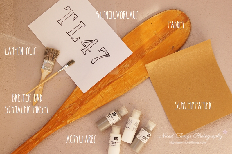 Für den Fall dass ihr auch so ein altes Paddel habt (geht mal suchen, vielleicht habt ihr ja Glück, auch auf Flohmärkten oder so…), habe ich hier eine kleine Anleitung für euch. Das Prinzip kann man aber auch auf andere Gegenstände wie Kisten, Kommoden oder Spiegelrahmen übertragen. Was man hier auf den Übersichtsfotos nämlich noch nicht so gut sieht: Der Anstrich ist nicht ordentlich, er soll ein bisschen alt und gebraucht aussehen. Und dann sind da ja noch Stencilnummern drauf. Also hier kommt die Anleitung…