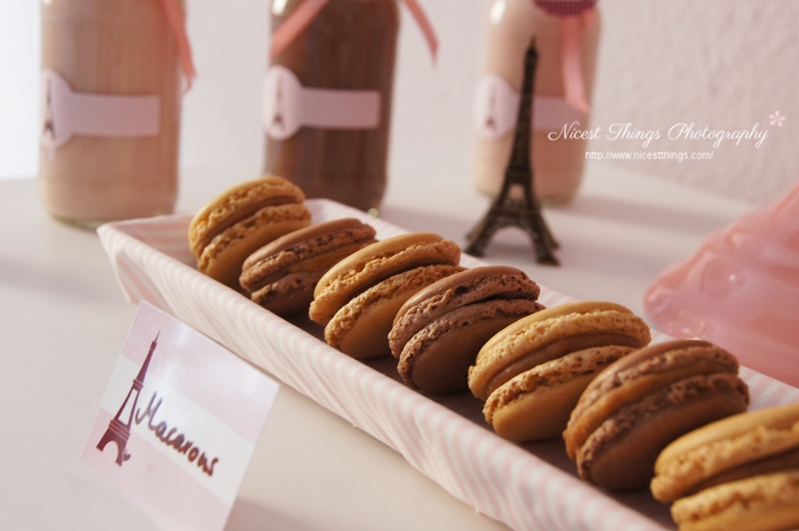 Keine Parisparty ohne Macarons, das ist ja wohl klar. Nur leider hätte ich tatsächlich fast ohne dieses tragende Element auskommen müssen. In der Epicerie hier in Heidelberg gibt es seit Monaten Packungen mit schönen rosafarbenen Macarons. Für zwischendurch waren die mir mit 12,50 natürlich immer zu teuer, aber jetzt für den Sweettable hatte ich ja eine gute Ausrede. Und was ist? Ausverkauft. Und das Ansichtsexemplar aus der Vitrine wollten sie mir nicht geben. Zum Glück hat Leonor’s in Handschuhsheim (klick) wieder geöffnet nach der kleinen Sommerpause und die liebe Leonor hat mir doch tatsächlich in einer Dreiviertelstunde diese köstlichen Schoko- und Karamellmacarons gezaubert! Damit war die Parisparty gerettet. Und Notiz an mich: Nicht erst am Tag der Party auf Macaronjagd gehen!