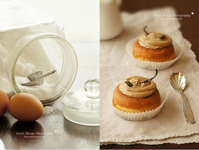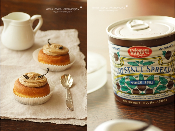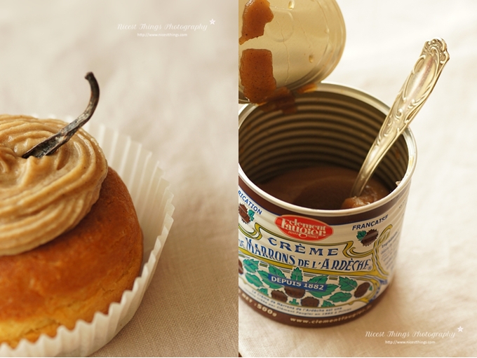Die fertige Maronencreme habe ich als Füllung für meine Baba au rhum verwendet. Wie das auf Deutsch heißt weiß ich leider nicht, aber das Rezept ist köstlich. Klassischerweise ein mit Rum und Zuckersirup getränkter Teigkringel. Ich habe zusätzlich die Kastaniencreme in die Mitte gepackt und mit Vanille garniert. Und damit man nochmal ganz deutlich sieht, dass es KEIN Cupcake ist: