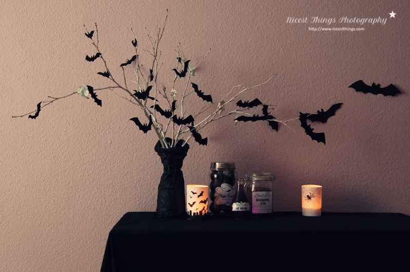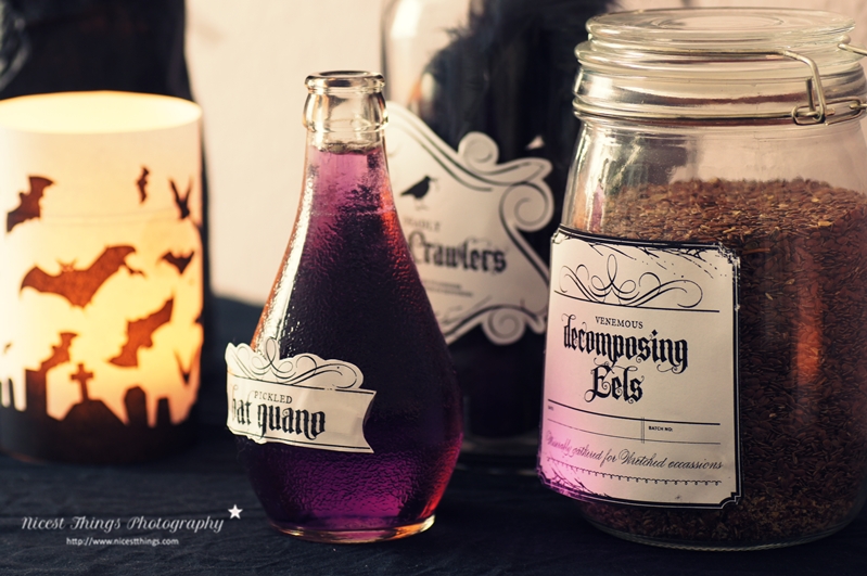 Dazu habe ich noch ein paar Gläser und Flaschen mit ekligem Inhalt (nicht) wie Pflaumen, schwarze Federn, Leinsamen und Wasser mit lila Speisefarbe gestellt. Ich hatte nichts Besseres, man könnte vielleicht Gummischlangen oder so nehmen, aber die gruseligen Etiketten reißen es in jedem Fall raus. Die Printable Vorlagen sind Freeware von HIER und ich habe sie von HIER.