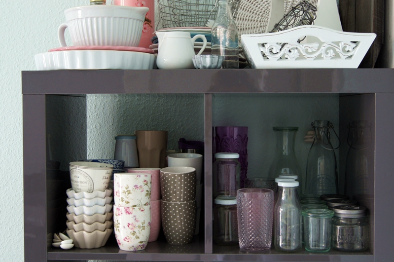 Für meine Foodbloggerei habe ich einen Haufen an Einzelteilen. Geschirr, Gläser, Besteck, Schälchen, Backsachen… Die habe ich zum Teil gesponsert bekommen, zum Teil hastig noch am Post-Tag morgens im Butlers gekauft oder zu Hause auf dem Dachboden aufgestöbert. Das liegt und steht alles in, auf, um und neben dem Ikearegal in der Küche.
