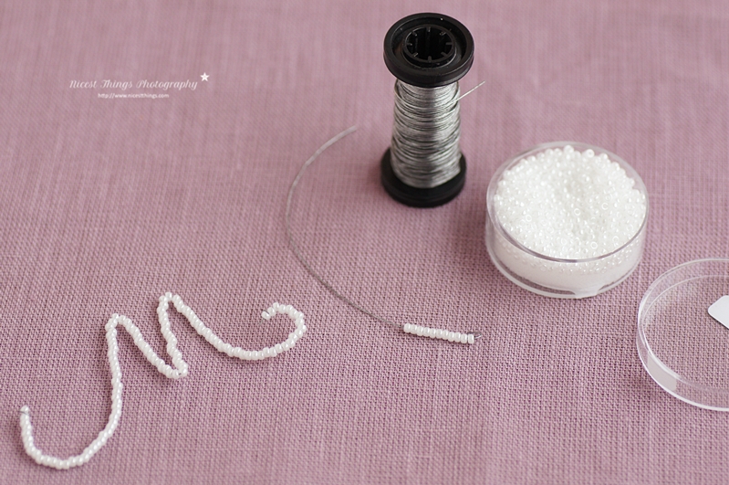 Zuerst ein Stück Draht in der Länge abschneiden, das der gewünschten Größe der Buchstaben ungefähr entspricht. Dann ein Ende eng umbiegen und Perlen auffädeln. Zum Schluss den Draht wieder umbiegen. Für Buchstaben, die aus mehreren Drahtstücken bestehen, diese einzeln anfertigen und dann umeinander schlingen.