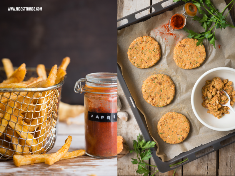 Rein logistisch bereitet ihr am besten alles in der Reihenfolge der Rezepte zu: Erst die Low Carb Burger Buns, die kann man auch schon am Vortag gut zubereiten und vor Verzehr nur kurz auftoasten. Dann die veganen Burger Patties mit Kichererbsen, die lassen sich gut warmhalten. Die Pastinakenpommes sollte man auf jeden Fall ganz zum Schluss zubereiten, damit diese wirklich warm und knusprig serviert werden. Den restlichen Belag kann man vorbereiten, während die Pommes im Ofen backen.