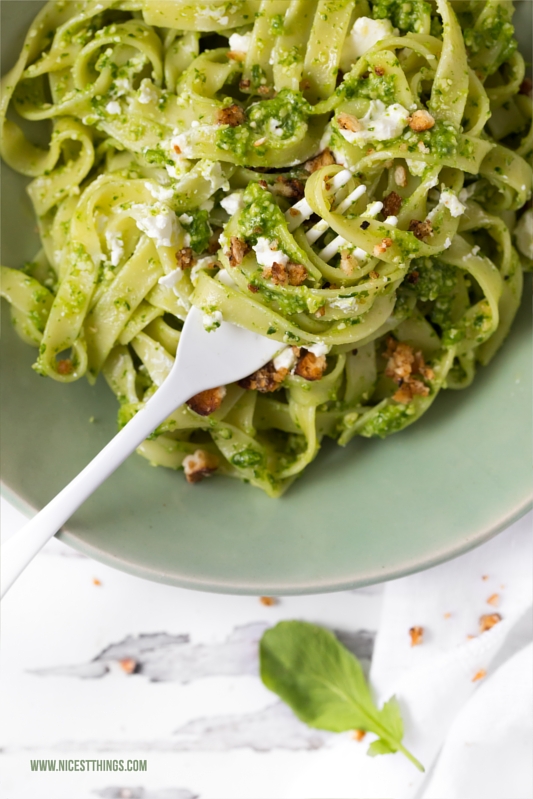 In diesem Post erzähle ich euch ein bisschen von meinen Strategien, wie man es schafft, weniger Essen wegzuschmeißen. Und ich gebe euch ein köstliches Rezept mit einer Zutat, die sicher schon bei vielen von euch in den Müll geflogen ist: Pasta mit einem Radieschengrün Pesto aus Radieschenblättern, serviert mit Ziegenfrischkäse und Laugen-Honig-Knuspertopping.