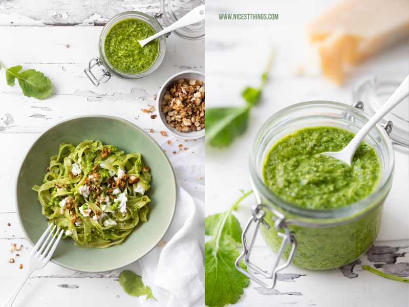 Das Radieschenblätter Pesto hat mir so gut geschmeckt, dass es nun unbedingt gebloggt werden muss. Zu Bandnudeln, zusammen mit cremigem Ziegenfrischkäse und knusprig-süßen Bröseln aus einem alten Laugenbrötchen und Honig schmeckt das phänomenal!