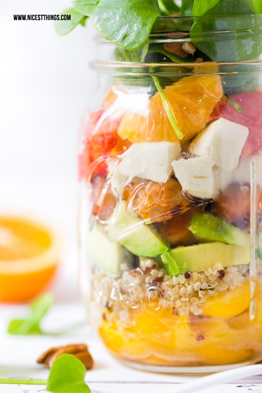 Salat im Glas mit Quinoa, Honig Hähnchen, Orange / Blutorange und Avocado, für 2 Personen: